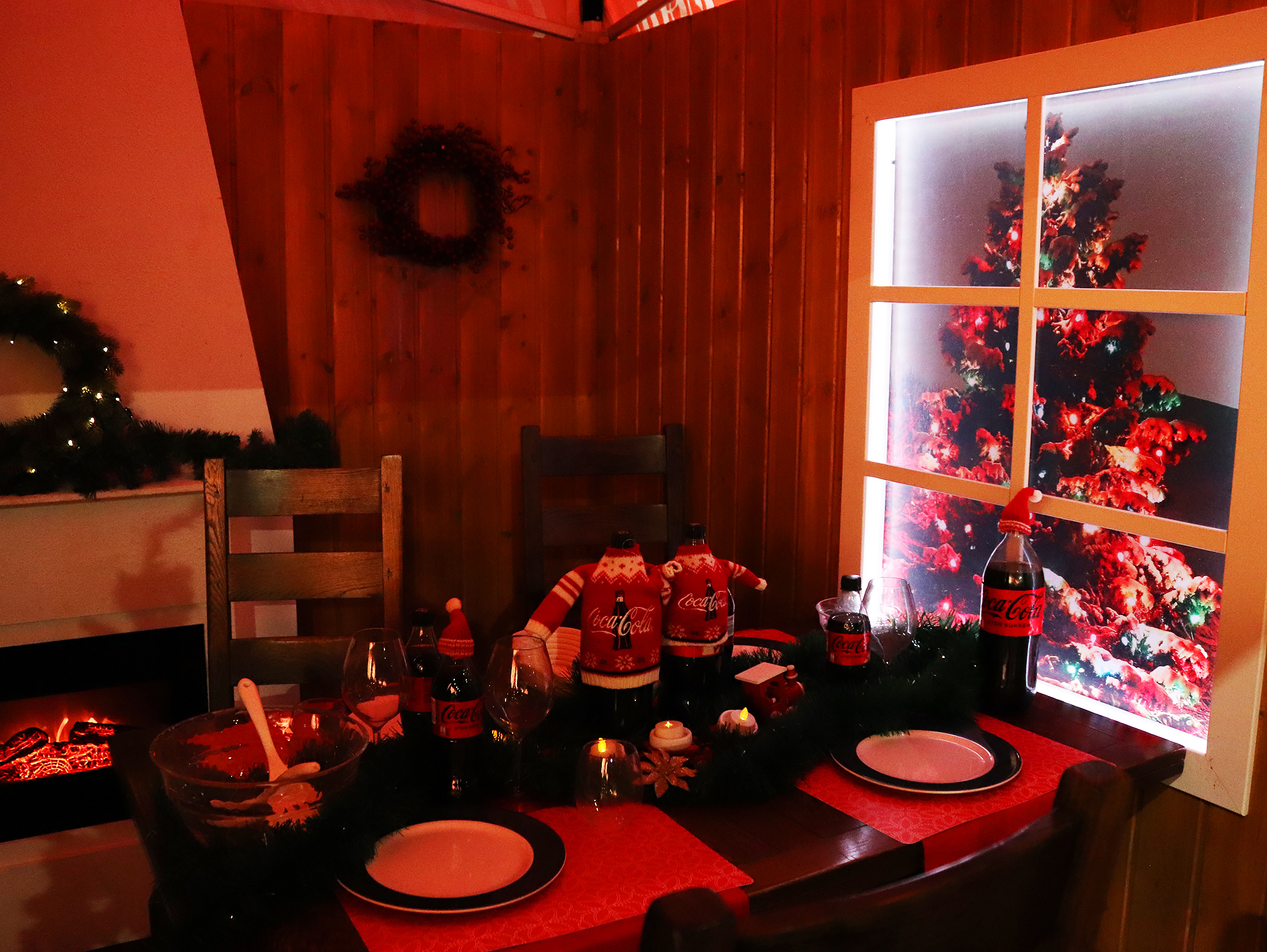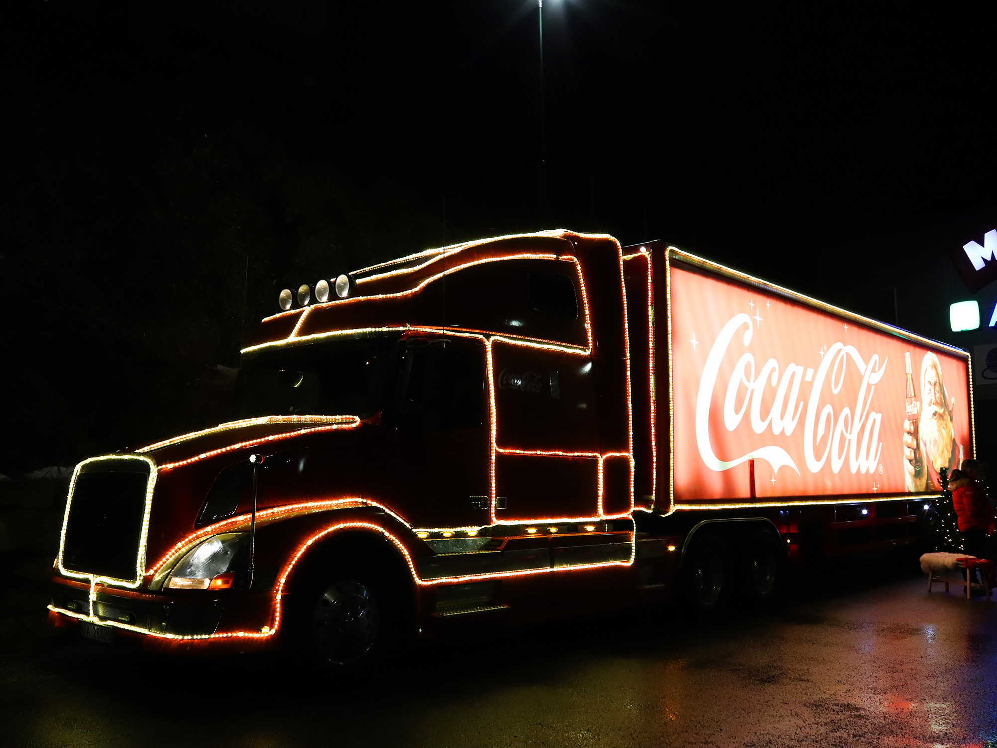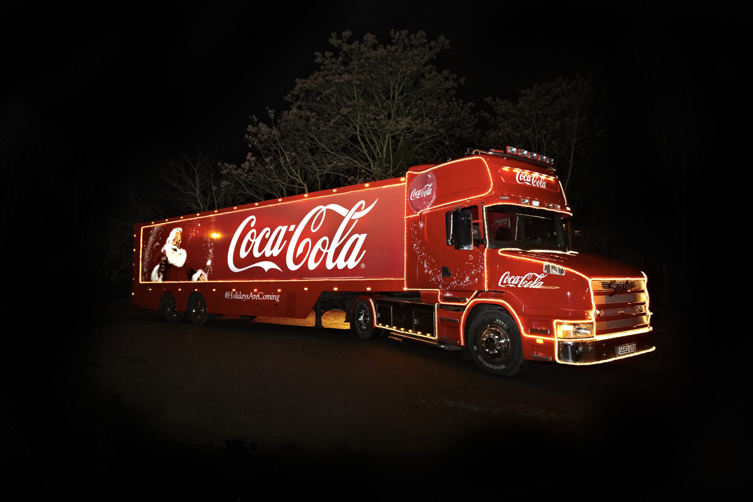 I reklamen ble tre 18-hjuls “kulisser” omdannet til en uendelig trailerkaravane, som kjørte gjennom daler og byer. Hver trailer var en 40-fots, 2-tonns “lysfontene” på hjul med mer enn 30 000 lyspærer. Dette ble muliggjort ved å kombinere live-bilder i full størrelse med miniatyrer, filmteknisk duplisering og digitale “matte paintings” (tegninger av omgivelser). Med litt animasjon kunne julenissen utbringe en skål for julen på slutten av reklamefilmen.
