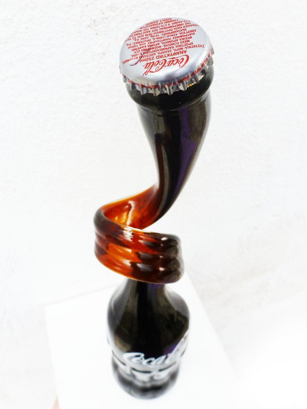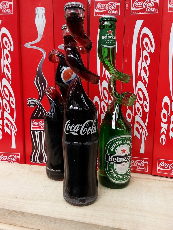 Det var spesielt glassflasker fra populære selskaper som Coca-Cola og Pepsi-Cola som ble deformert på denne måten. Men enkelte øl-flasker er også funnet.